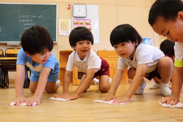 床の拭き掃除にも、みんなで「協力」している雰囲気が感じられ、雑巾がけをする姿もカッコいいです。