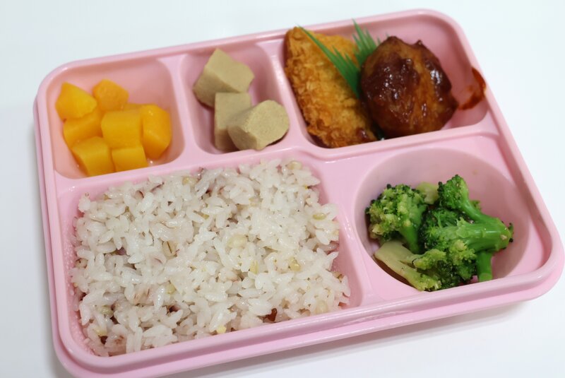 八穀ごはん、チキンかつ、トマトソースハンバーグ、高野豆腐煮、ブロッコリーのごま和え、黄桃缶、371kcal