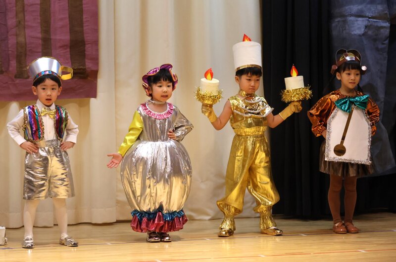 そして、きょうの「トリ」を務めますのは、年長の「にじ組」さんです。演じる劇は、「美女と野獣」。ステージ開始を前にして、みんなで円陣を組んで気持ちをひとつにまとめます。先生の「にじ組さん、みんなでがんばろう!!」の声に「おーっ!!」と応えるお子さまたち。さあ、言語劇「美女と野獣」のはじまりです。