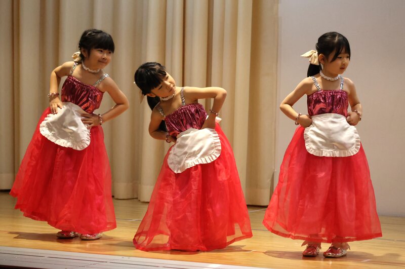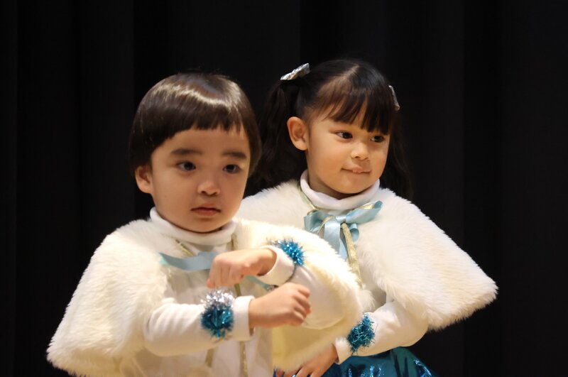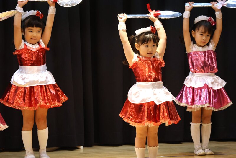 ピンクと赤という微妙に異なる色の衣装が、ちょっとしたアクセントを生み、お子さまたちのステージングを引き立ててくれます。
