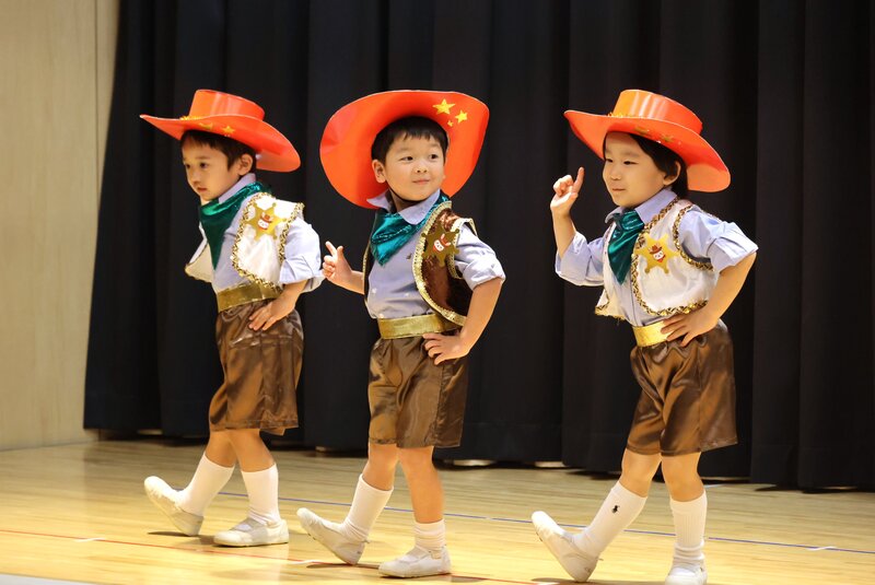 トップバッターは、「うさぎ組」さん。かわいらしいカウボーイ姿で登場です。こちらのお子さまたちが踊る曲の曲名は、この衣装のとおり「ちびっこカウボーイ」。カントリーミュージックを思わせる軽快な曲調が、元気な「うさぎ組男子」には、ぴったりです。
