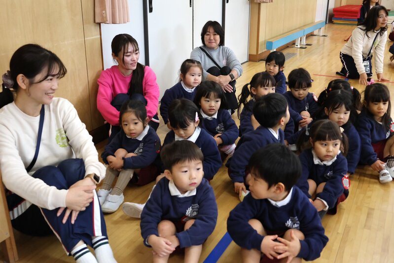 もちろん、「いちご組」さんも「先輩」たちの横にしっかりと席を確保して参加です。「いちご組」さんは、9月にフルメンバーによる一斉スタートを切り、きょうの「終業式」まで2学期とともに歩んできました。その「歩み」を振り返るように、司会の先生が2学期の出来事をお子さまたちに尋ねます。