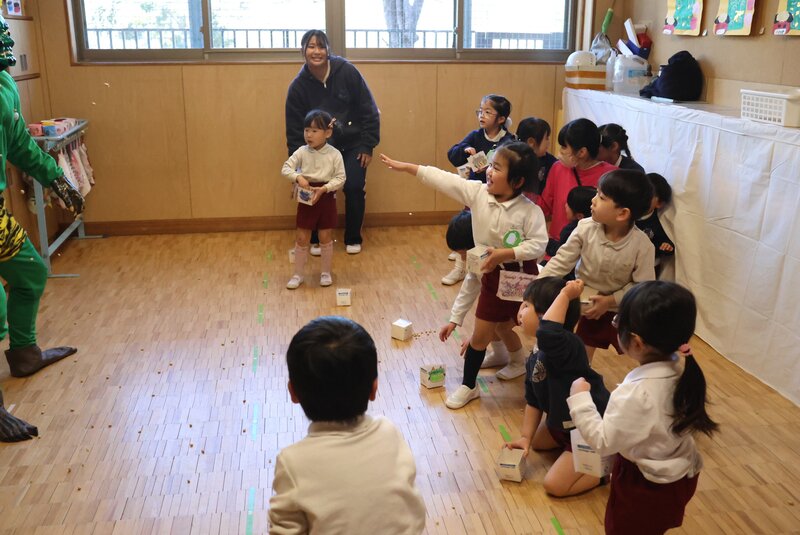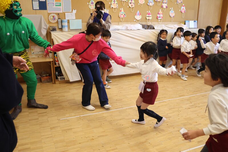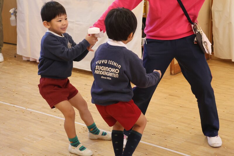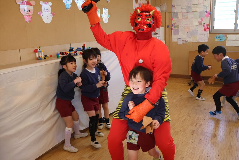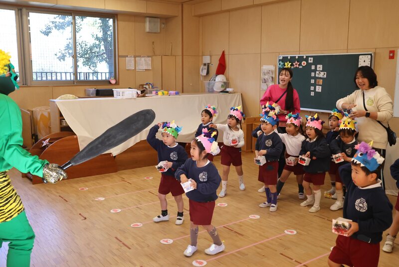 しかし、年少さんを甘く見ていた鬼さんたちは、ここでもたっぷり「豆」を投げられて完敗。