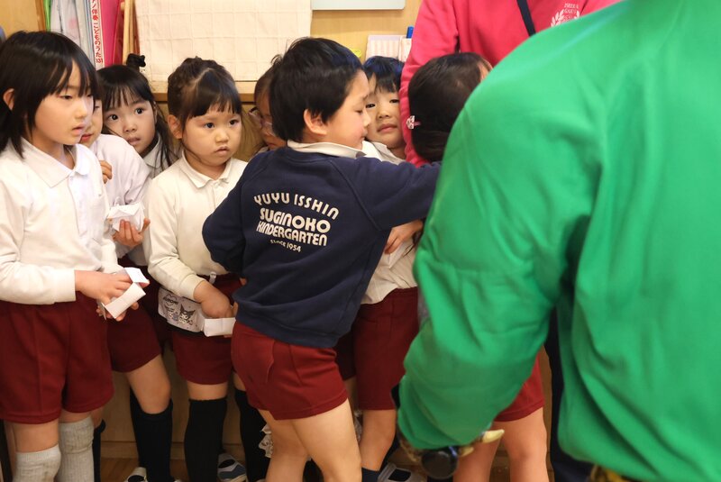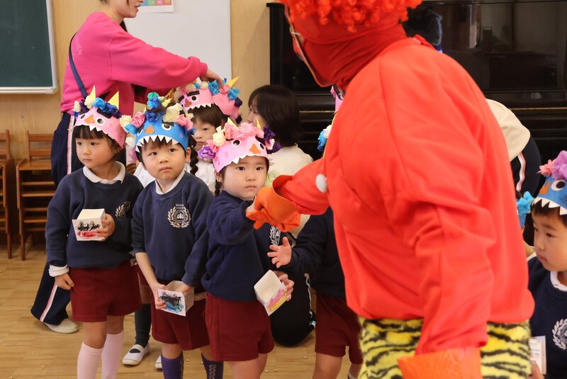 お子さまたち、みんながんばりましたね。コワかったかもしれないけど、みんなの「やさしさ」で、最後は鬼さんたちも「良い心」をおみやげにして鬼ヶ島に帰りました。きっと、いまごろは「もういちど、人間になりたいな……」と思っていることでしょう。そう、鬼さんは、鬼さんになる前はみんな人間だったんです。きょう来た鬼さんたちは、以前はある幼稚園の子どもたちだったんです。お友だちをいじめたり、悪いことばかりしていたものだから、「豆まき」のときに鬼ヶ島の「鬼之子幼稚園」に入れられて、だんだん鬼に変わっていったんです。だから、きょう杉之子幼稚園のお子さまたちの「やさしさ」に触れて、「もういちど、人間になりたい」と思ったんですね。でも、いちど鬼さんになると、人間には戻れないそうです。杉之子のみんなも、お友だちやさしくして鬼さんに連れていかれないようにしましょう。