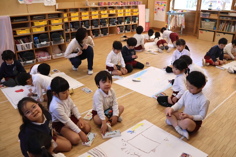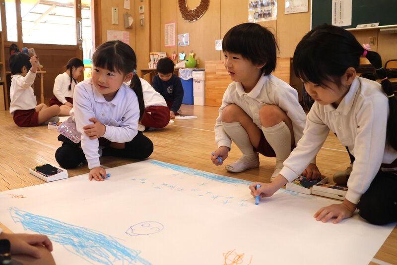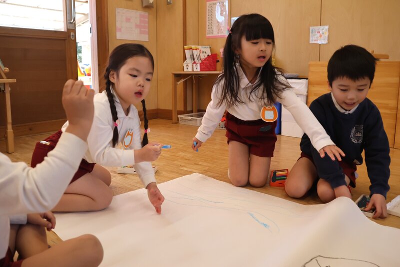 「ひまわり組」さんは、グループにわかれてお絵かきをしていました。「模造紙」がお相手ですので、なかなかダイナミックなお絵かきです。