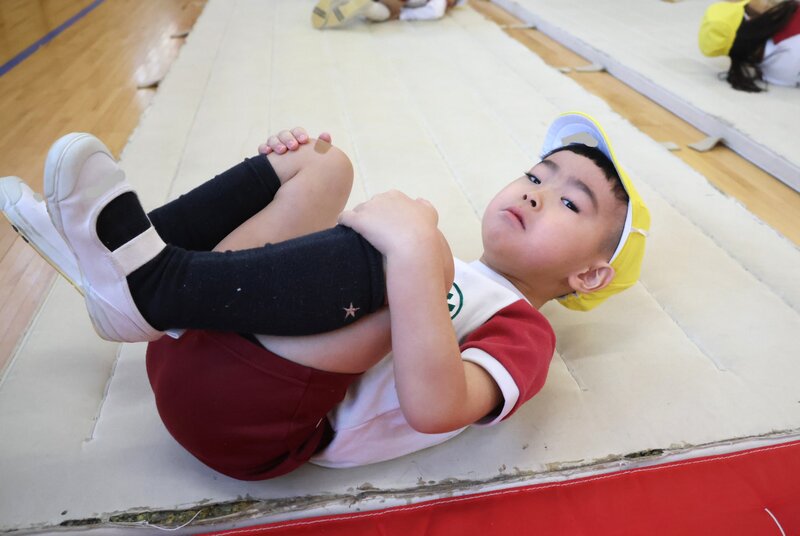 お芋コロコロの「ジャガイモ」版です。「お芋コロコロ」は、全身を伸ばしてコロコロ転がりますが、「ジャガイモコロコロ」は、足を折りたたんで転がります。これらをひととおり経験したところで、いよいよ本命の「前転」の練習に入ります。