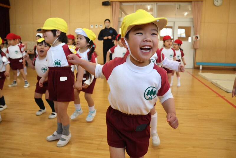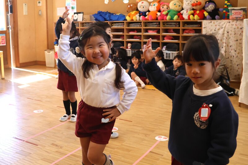 では、「きょうのすぎのこ」です。きのうは、かわいらしい「鬼」さんの衣装でコワい「鬼」さんを驚かせた「いちご組」さんのお子さまたち。きょうは、お部屋でダンスの練習をしていました。床をみますと、立ち位置の線が引いてあって、なんだか本格的です。それもそのはず……。