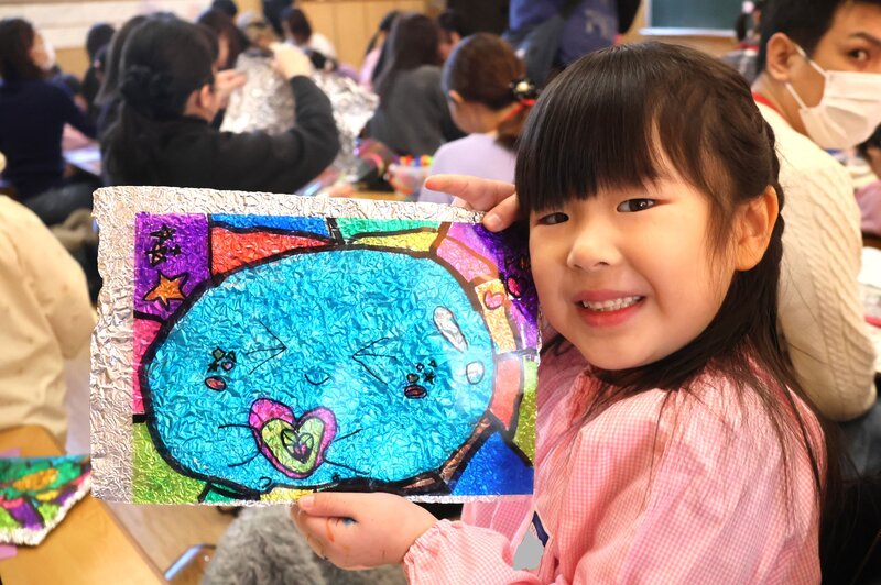 そして、きょうの最後を飾るのは、こちら。年長さんの「おやこ de あーと」です。きょうは、年長さんの保護者の方にご来園いただき、お子さまと一緒に製作を楽しんでいただきました。何をつくったのかといいますと……、