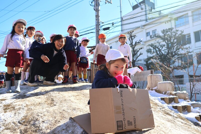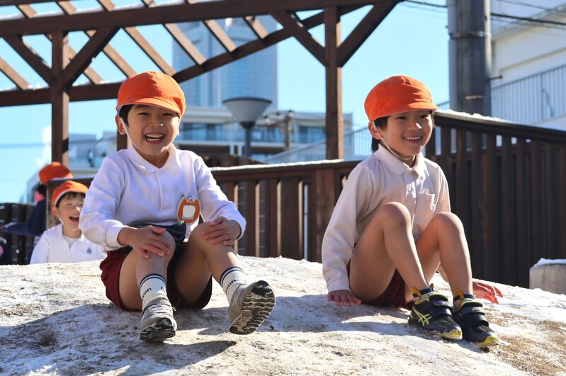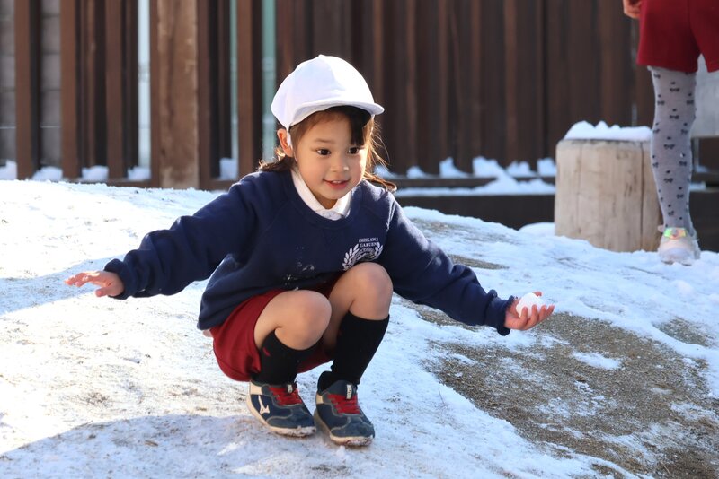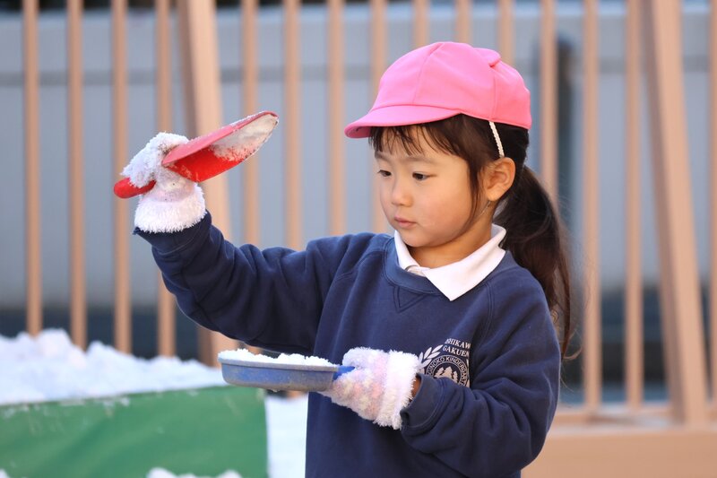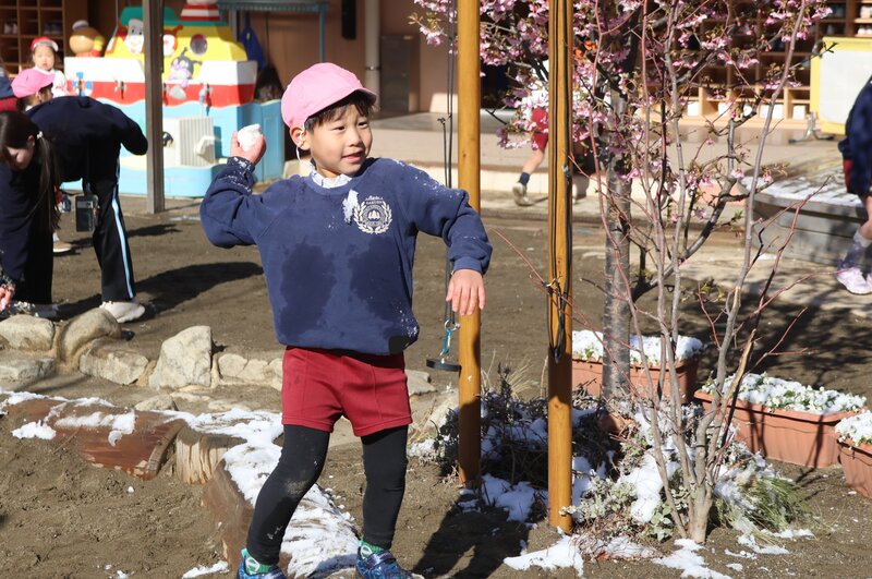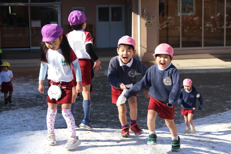 園庭に降りそそぐお日様の光と雪の白さが、お子さまたちのいきいきとした表情を一層、引き立ててくれているように感じます。