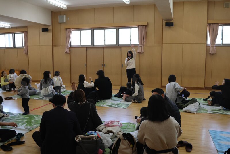 年長さんは、「朝の会」のあとに卒園式でうたう歌の練習をしていました。年長さんのお部屋の前のテラスには、お子さまたちの元気な歌声が届いていて、見学してくださったお客さまたちも目を細めながら聴いてくださっていました。