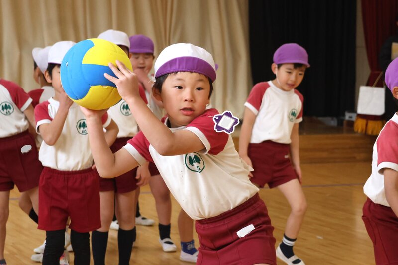 年長さんは、火曜日なので「体操指導」がありました。きょうのテーマは、「ボール投げ」。写真に写っている4つのブロックは、「まと」です。ちなみに、この場面では男子チームと女子チームにわかれて対戦中。「まと」に向かってボールを投げて、みごとブロックが倒れますと1点が与えられます。
