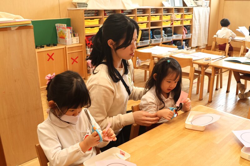 「りす組」さんは、先生と一緒に「はさみ」の練習です。