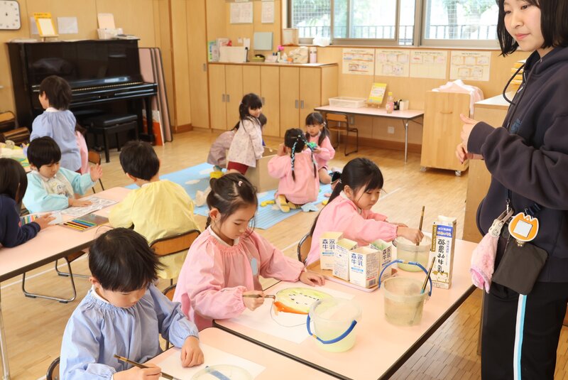 どこがどんな色なのか。その色は、どうやったらできるのか。先生のアドバイスを受けながら、いろいろと思考錯誤を重ねるお子さまたち。きょうの「仕上げ」で、お部屋の壁が一面の「キウイ畑」になりそうですね。