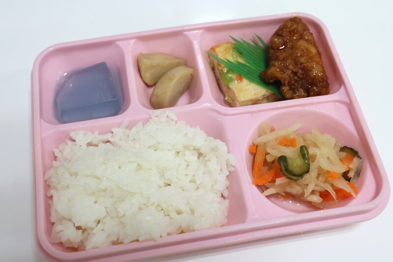 あたたかな白飯、甘辛唐揚げ、豆腐のふわふわ寄せ、さといも煮、切干大根のサラダ、サイダー風ゼリー 405kcal