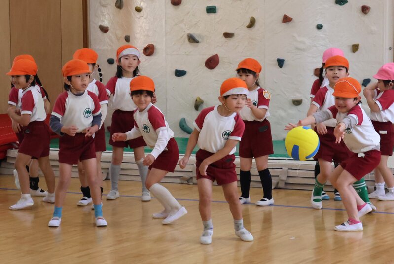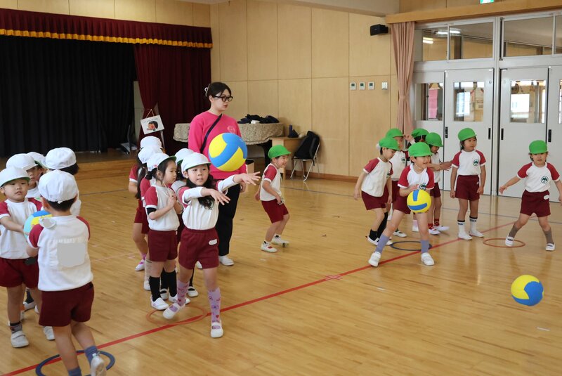 年中さんは、金曜日なので「体操指導」がありました。きょうのテーマは、「ボール投げ」です。お子さまたちがボールを投げる先には、「まと」になるブロックが立ててあります。この練習は、いつもご紹介していますね。