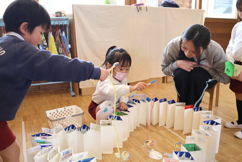 こちらの「さかな釣り」。一度に大勢ではできませんので、順番に楽しみます。釣り糸を垂らせば必ず釣れる「さかな釣り」は、「行けばボウズ」のjimjimにとりましては、うらやましいかぎりでありました。