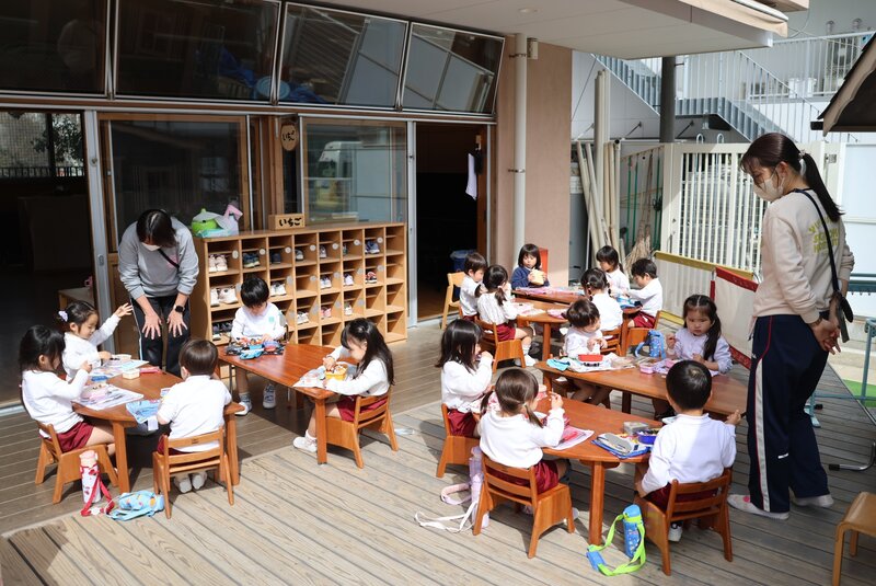 その「いちご組」さん、ランチはお部屋の前の「ひだまりデッキ」でいただきました。お友だちや先生と一緒にお部屋の外で食べるランチのお味は、格別かもしれません。