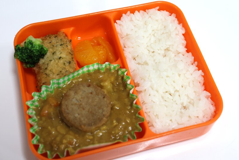 カレーライス、プチハンバーグ、ブロッコリー、青のり白身魚フライ、みかん缶、431kcal
