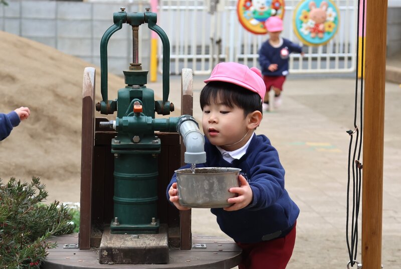 「ガチャポンプ」から流れ出るお水を一生懸命に器に入れる男の子。ダムのお水が少なくなったら、「ガチャポンプ」もお休みになってしまうかもしれません。そうならないように、雨が降ってくれるといいですね。