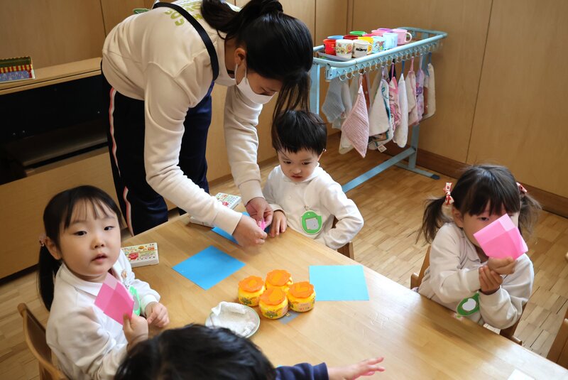 話は変わりますが、明日は「ひなまつり」ですね。それにあわせた「製作」を進めていたのは、こちらの「くま組」さんと「ひよこ組」さんです。