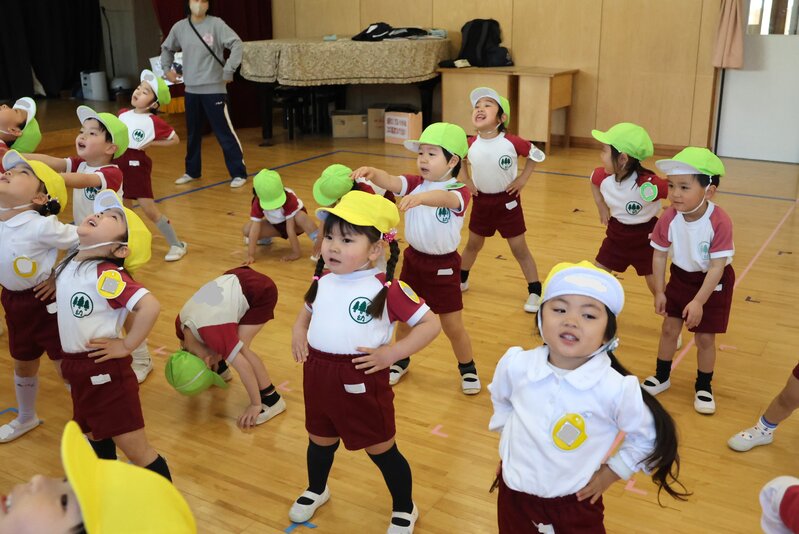 年少さんは、水曜日なので体操指導がありました。きょうも、定番の「ゆかいな準備体操」でスタート。なんとなく、まとまっているようでまとまっていない、この感じが年少さんらしさなのですが、この子たちも1か月後には年中さんです。年中さんになったら「ゆかいな準備体操」を卒業して、「ヤル気の準備体操」にシフトしたいところですね。