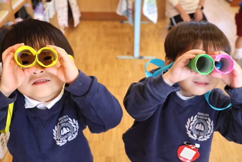 さて、ここからはきょうの主役である「いちご組」さんの出番です。まずは、こちらの写真。どうやら、トイレットペーパーの芯を使って、「双眼鏡」をつくったようです。jimjimがお部屋にうかがいますと、みんなで双眼鏡越しにお出迎えをしてくれました。
