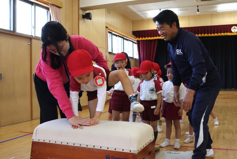 きょうのメニューは、「跳ぶ」のではなく「登る」こと。どんなやり方でもいいので、とにかく跳び箱の上まで「登る」ことがメインテーマです。