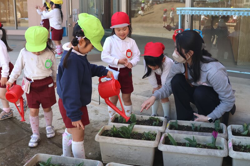 正午過ぎに帰園しまして、ランチをいただいていますと、事務室の窓から年少さんのお子さまたちが「ちゅうりっぷ」にお水をあげている光景が目に入りました。そのときに撮影したのが、下の写真です。