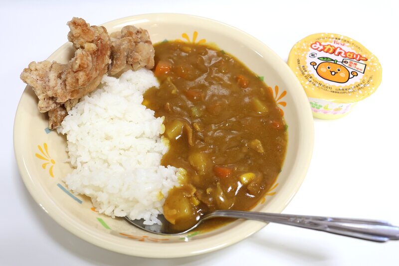 あたたかなポークカレー、鶏の竜田揚げ、みかんゼリー、541kcal