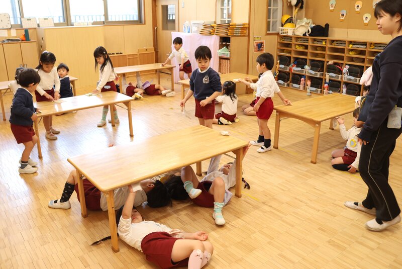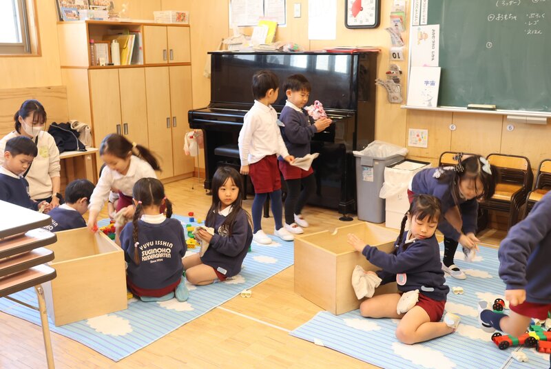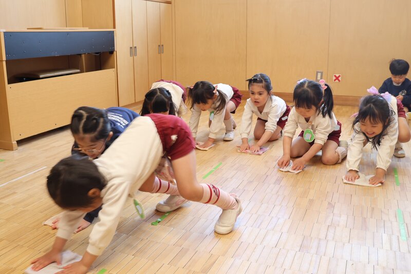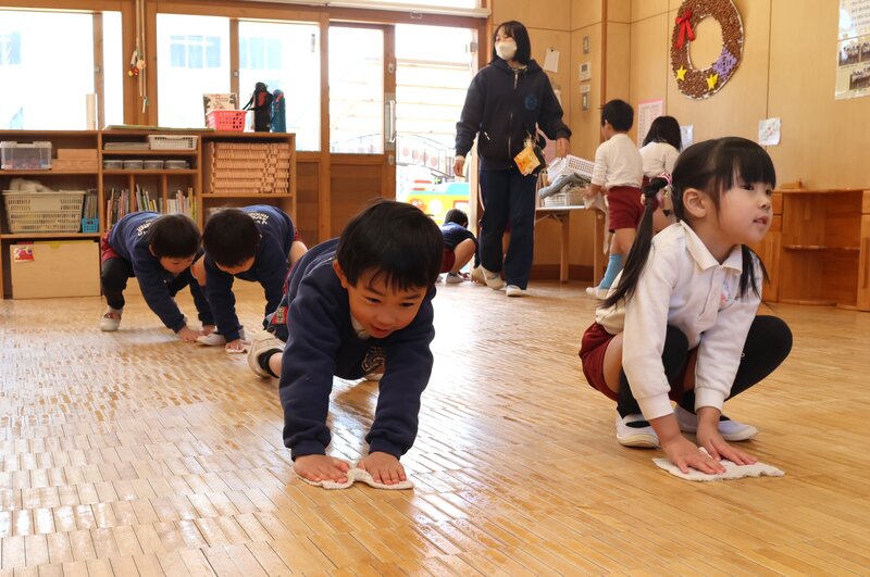 こうしてみんなで協力し合う姿は、もはや「年少さん」の域を超えていました。年中さんに向けての準備は、もうバッチリみたい。そんな頼もしさを感じさせてくれた、きょうの大掃除でした。