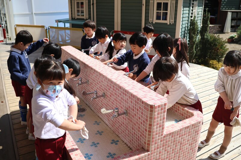 さて、年長さん以外のお子さまたちはと言いますと、きょうは皆さん「大掃除」にのぞんでいました。手洗い場は、どこも満員。
