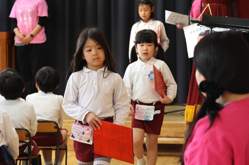 年長さんたちにとりましては、幼稚園で迎える最後の月曜日になるからです。今週の金曜日には、いよいよ「卒園式」を迎える年長さんのお子さまたち。きょうも、「卒園式」の練習に余念がありませんでした。