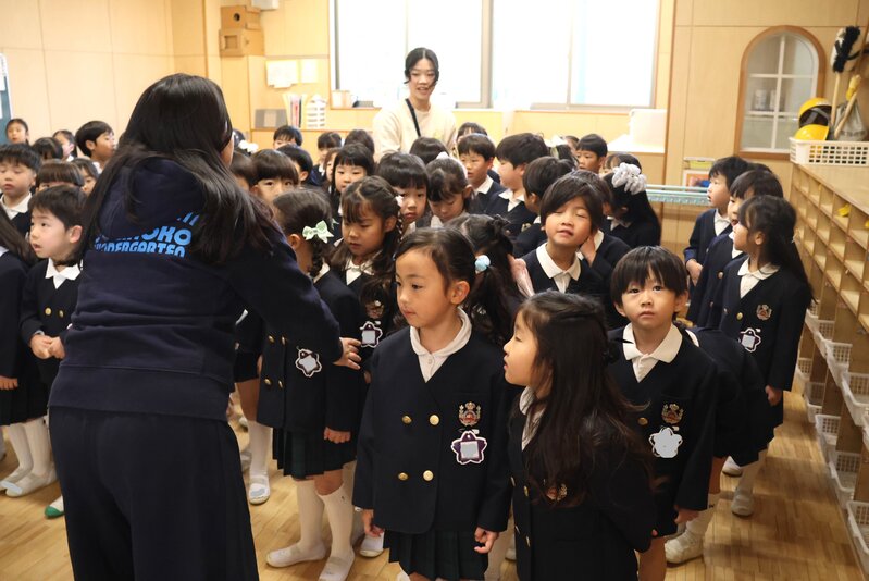 うたのあとは、3年間の幼稚園生活を振り返るスライドショーが上映されました。こちらは、担任の先生たちが毎日、一生懸命に写真を集めてつくっていた力作です。お子さまたちの成長の証しがスクリーンを通して伝わってきて、保護者の皆さまの3年間の記憶を呼び起こしていたようでした。こうして、ホールでの「全体会」が終わりますと……、