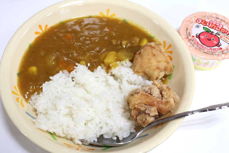 ポークカレー、鶏の竜田揚げ、リンゴゼリー、543kcal