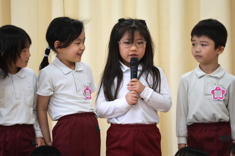 「お誕生日会」の内容につきましては、毎月お伝えしておりますのでご存じの方も多いかと思います。お誕生月のお子さまたちは、前に出てきて自分のクラスとお名前を言います。わずかそれだけですが、はじめてのことなので、どうしても緊張感に包まれるのは仕方のないことでしょう。きょうは、勇気を出してちゃんとクラスとお名前を言うことができました。隣の女の子と手をつないでいるところが、とてもかわいらしいです。こういう純粋さが、年少さんらしくてとてもいいですよね。