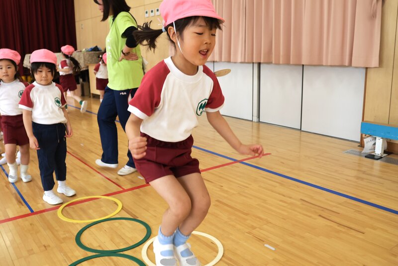 きょうのメニューは、列の先にあるブロックを1周して戻ってくるというシンプルな内容でした。でも、バリエーションは豊富です。ケンケンジャンプで進んだり……、
