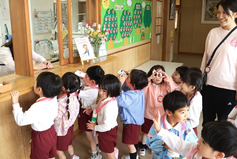 では、「きょうのすぎのこ」をお伝えしてまいりましょう。こちらは、手作りの双眼鏡を片手に「園内探検」にお出かけした年少の「りす組」さんです。職員室の前に来て、園長先生にご挨拶。園長先生のお顔を双眼鏡で覗き込むお子さまも……。
