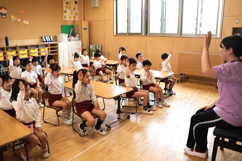 年長さんのお部屋に行きましたら、「にじ組」さんは、きのうの「つき組」さんと同じように栽培する植物を決めていました。「トウモロコシ」「スイカ」など、いろいろと候補があがっていて、多数決で決めるようです。写真でも、お子さまたちが手をあげていますね。でも、これは、「ウォーミングアップ」なんです。